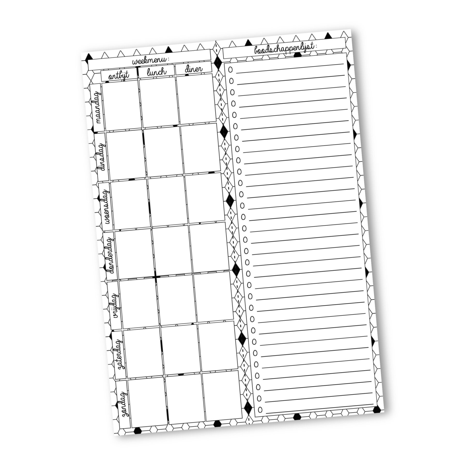 Dit boodschappenlijstje heeft een A4 - formaat. Er is ruimte voor een weekmenu. Het lijstje heeft een geperforeerd randje waardoor deze makkelijk kan worden afgescheurd en mee worden genomen naar de winkel.