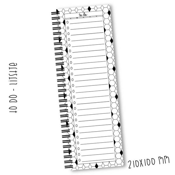 - To do-lijstje met het formaat 210x100 mm met een ringband aan de linkerzijde. Dit boekje is dubbelzijdig bedrukt.