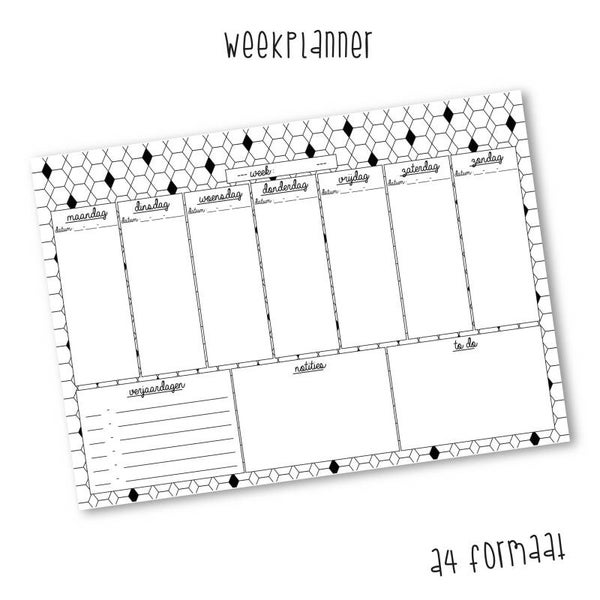 - Weekplanner op A4-formaat aan de bovenzijde gelijmd op karton.