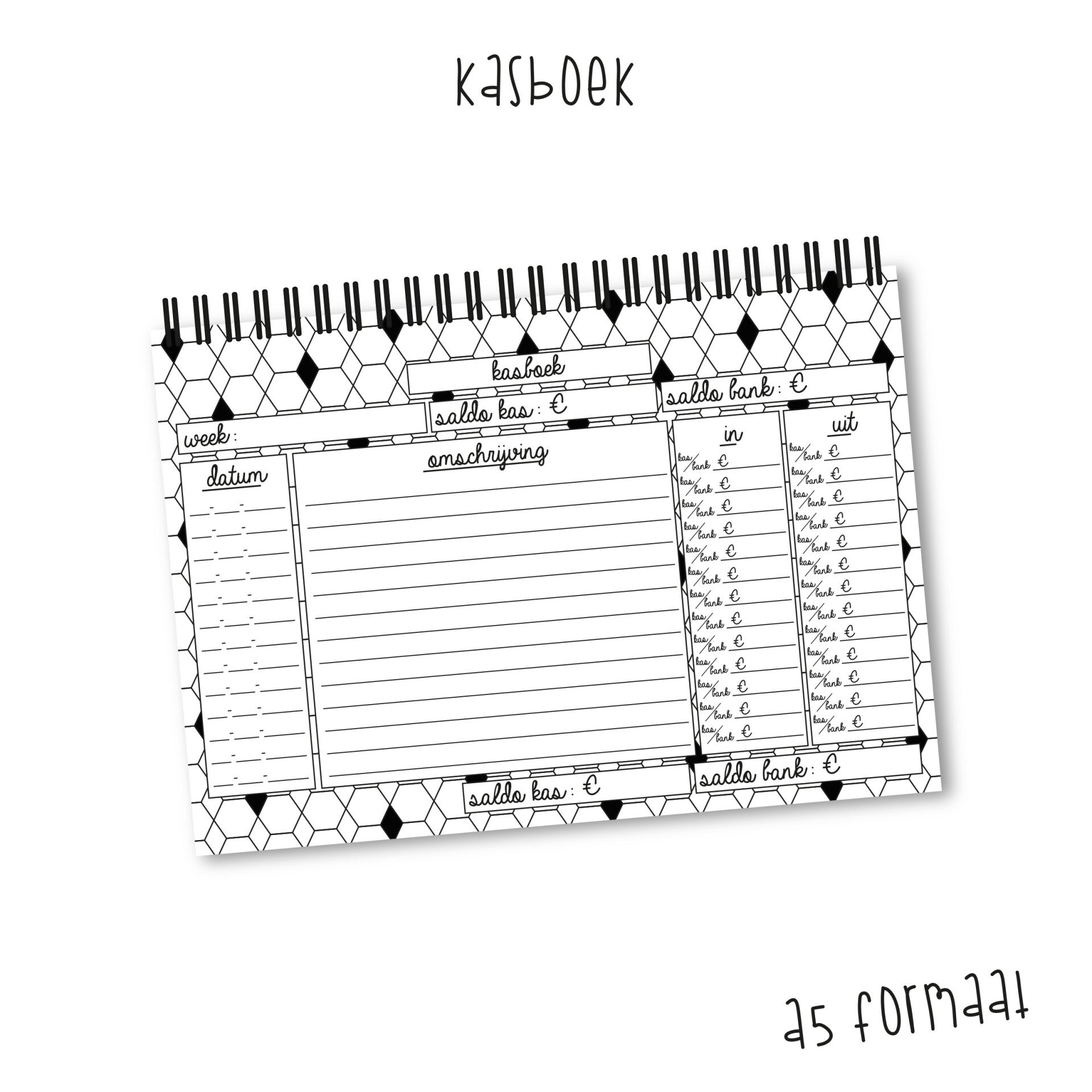 - Kasboek op A5-formaat met een ringband aan de bovenzijde.