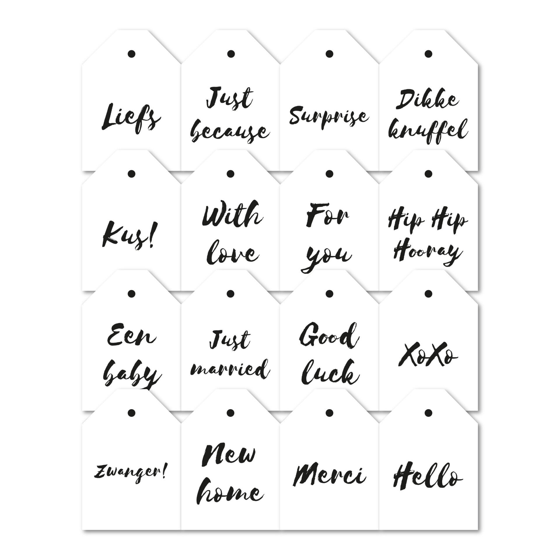 Deze labels zijn enkelzijdig gedrukt op 260 grams stevig papier en hebben een gaatje aan de bovenkant om ze mee op te hangen. De afmeting is 52x74 mm (A8-formaat).