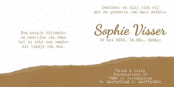 Dit leuke geboortekaartje heeft een afmeting van 11,5x11,5 cm en wordt geleverd met een envelop.