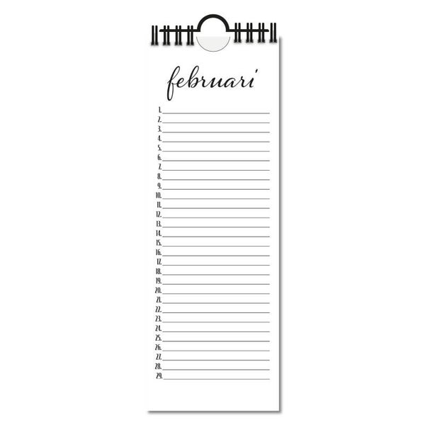 De kalender heeft een formaat van 105x297 mm en is enkelzijdig bedrukt op 300 grams papier.Aan de bovenkant heeft de kalender een haakje waarmee deze kan worden opgehangen.