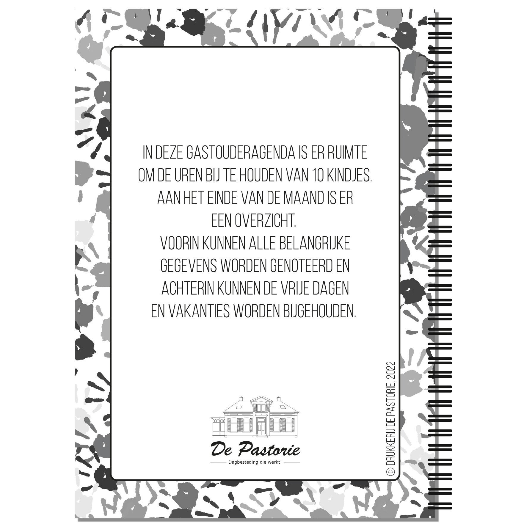 De gastouderagenda heeft een A4-formaat. In de agenda is er plaats voor 10 kindjes. Voorin de agenda kan alle belangrijke informatie over een kindje worden geschreven. Per dag kan het aantal uren worden opgeschreven met aan het einde van de week een totaaloverzicht. Na elke maand is er ruimte voor een maandoverzicht. Achterin de agenda kan een overzicht van de vrije dagen worden opgeschreven en de vakanties kunnen per kindje worden aangekruist.